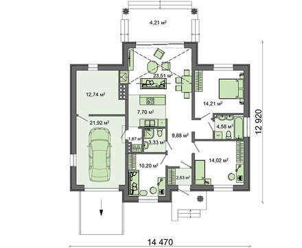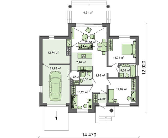 Личное пространство представлено тремя спальнями и двумя санузлами. Технический блок включает гараж для хранения автомобиля и котельную, ее дополнительно используют как мастерскую.