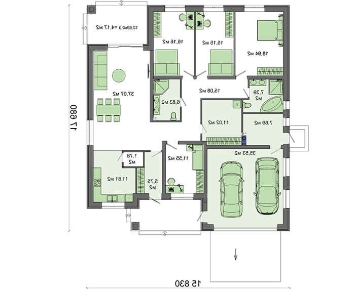 Несмотря на одноэтажную постройку элегантный и стильный жилой спроектирован для проживания большой семьи. В его стенах скрываются четыре комфортабельные спальни разного размера. Каждый член семьи имеет возможность подобрать комнату под свои предпочтения. Не стоит забывать, что одна из спален расположена отдельно, что дает ее хозяевам некую свободу.