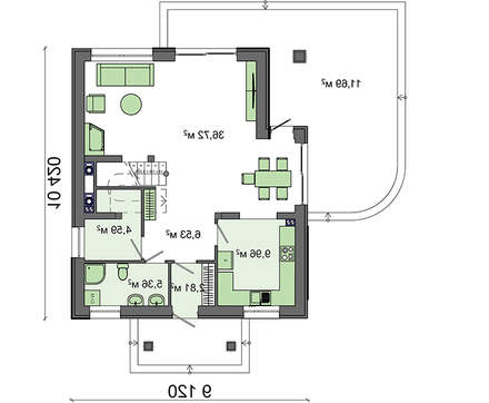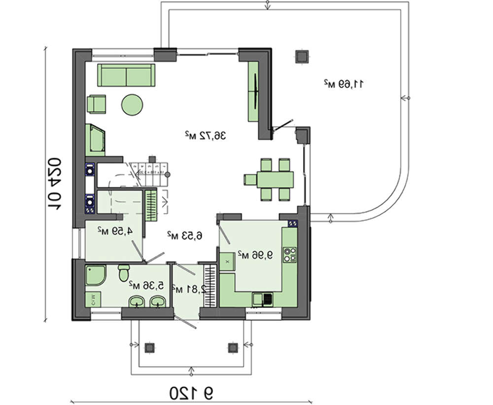 Первый этаж дома представляет собой уютную дневную зону. Здесь вы найдете все необходимое для нормальной жизни современного человека. Лестница в мансарду, вынесенная в центр этажа, служит своеобразной границей между гостиной, столовой и кухней. При этом сохраняется целостность всего пространства. Большая площадь остекления позволяет дневному свету беспрепятственно попадать внутрь помещений и добавляет уюта дневной зоне. А угловая терраса, на которую можно выйти из гостиной и столовой, зрительно расширяет пространство.
