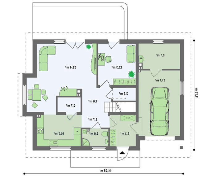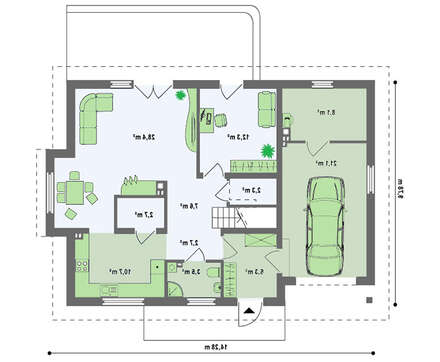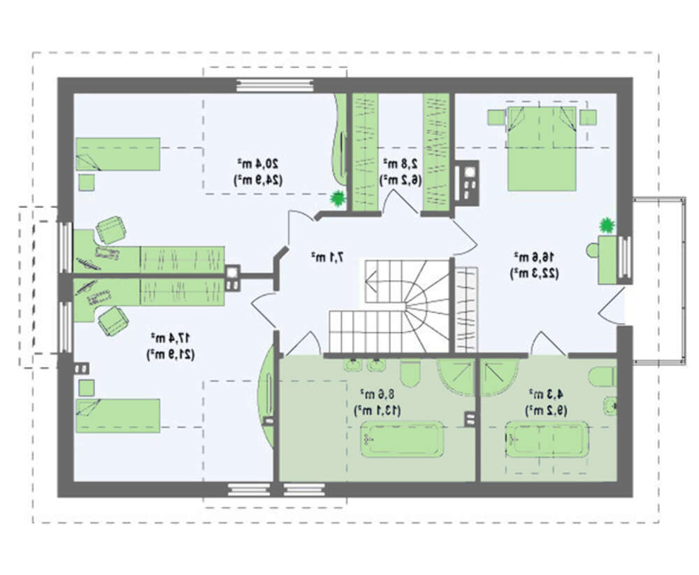 Домик 4М242 – это олицетворение вкуса и простоты, уюта и гармонии. При сравнительно небольших размерах дом вмещает все, что нужно для жизни благополучной семьи. Войдя в дом, попадаешь в светлую и просторную гостиную. Тут есть и кабинет – мечта любого делового человека, и комфортная кухня – на которой можно приготовить только шедевры. Она плавно переходит в зону столовой, а потом гостиной. В глубине дома, между кабинетом и прихожей, спряталась лестница. Она-то Вас и приведет на второй  этаж – мансарду. Здесь открывается царство морфея. Три уютные спальни, одна из которых имеет выход на балкон и собственную ванную комнату, обеспечат хозяевам и их гостям сладкие сны. У лестницы расположилась вторая ванная комната. Она идеально подойдет для гостей, а любая хозяйка может упиваться ее просторами. Все удобства и достоинства дома дополняет гараж, пристроенный к нему с левой стороны.