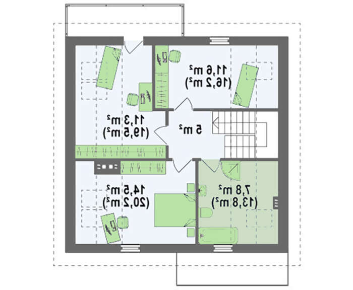 На втором этаже предусмотрены спальные комнаты для остальных четырех членов семьи – родителей и двух деток. В ванной комнате, помимо душевого бокса, вполне нашлось место для ванной – любители пенных пузырьков будут удовлетворены.