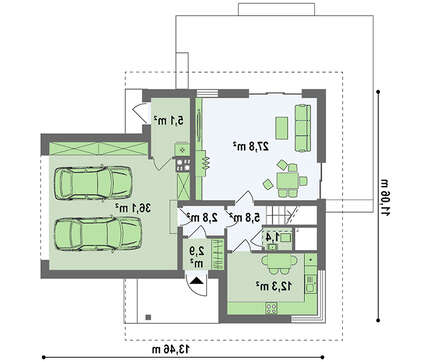 Планировка здания отличается компактностью и рациональностью. В пространстве гаража прекрасно помещается два автомобиля, а прилегающая комната может быть использована для хранения инструмента и выполнения слесарных работ. Кухонная зона имеет достаточные размеры для проведения семейных завтраков и обедов. Сгруппированная вокруг камина гостиная территория легко помещает пышный праздничный стол и мягкую мебель, необходимую для ведения деловых переговоров и дружеских бесед. Предусмотрительно выполненный выход на загородную территорию условно раздвигает стены и позволяет часть встречи перенести в царство растительности.