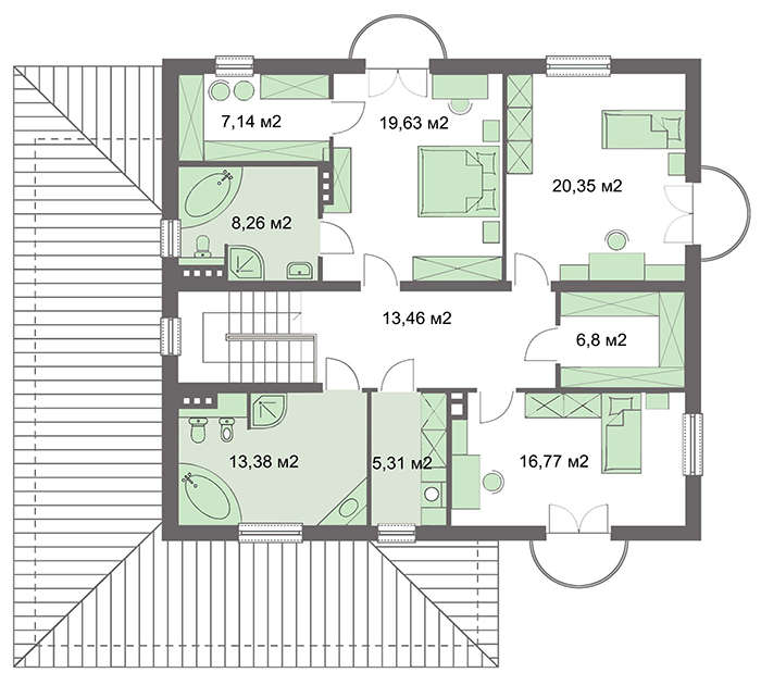 Второй этаж представлен спальными апартаментами, которые позволяют по-королевски отдохнуть и насладиться покоем. Все три помещения имеют выход на личный балкон. Большие размеры комнат позволяют установить самую разнообразную мебель. Особо выделена спальня хозяина. Ее особенность в просторном санузле, вместительном индивидуальном гардеробе.