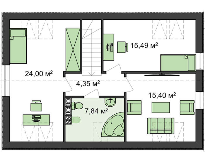 Дом компактный и рассчитан на небольшую семью. Но если вам понадобятся дополнительные квадратные метры, вы всегда сможете их получить, переоборудовав чердачное пространство под жилую мансарду. И места там хватит не только на дополнительную спальню. Можно оборудовать еще одну ванную и кабинет.