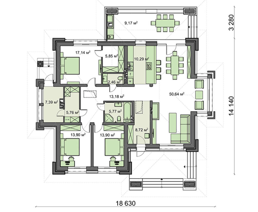 Внутренняя площадь в 164 кв. м грамотно разделена на два блока помещений: гостиный и жилой. В первом, занимающим треть общего пространства, расположился просторный зал с камином и эркером. В районе очага можно установить мягкую мебель и долгими вечерами наслаждаться отдыхом под потрескивание горящих дров. В эркере уместно будет организовать зимний сад, и оборудовать его удобными креслами. Здесь, любуясь прекрасными зелеными насаждениями, приятно выпить чашечку кофе.