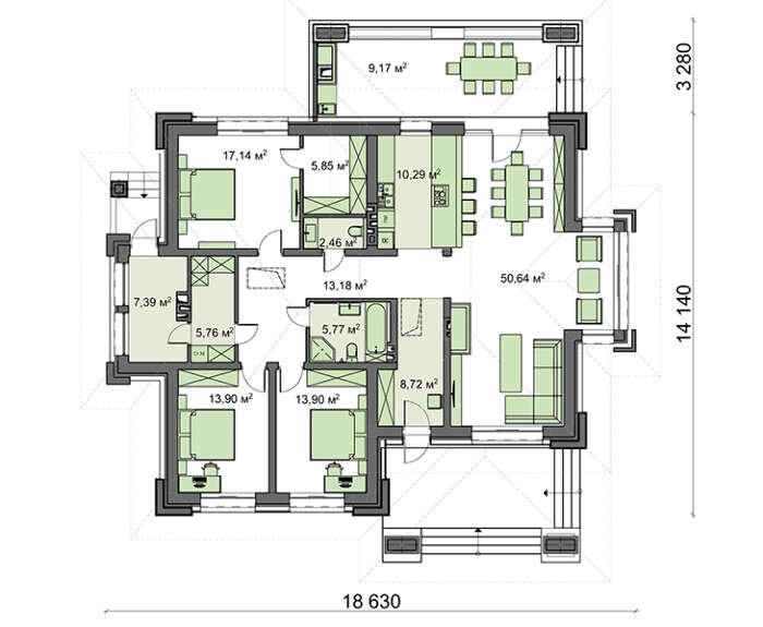 В противоположной стороне как нельзя, кстати, будет банкетный стол. Близкое расположение кухни сделает удобным проведение праздников и торжеств. В летнее время площадь гостиного зала увеличивается за счет террасы со стационарным мангалом, обеспечивающим семью вкусным жареным мясом.