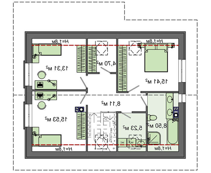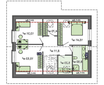 Внутренняя планировка пространства выполнена, согласно европейскому стилю. Здесь нет просторных холлов и «лишних» метров. Небольшие коридоры выполняют задачу обеспечения свободного доступа к отдельным помещениям. Несмотря на компактность и небольшие габариты коттедж максимально функционален. Первый этаж содержит комнаты общего пользования: гостиную-столовую, кухню, кабинет, второй — личные спальни для ночного отдыха жильцов дома.