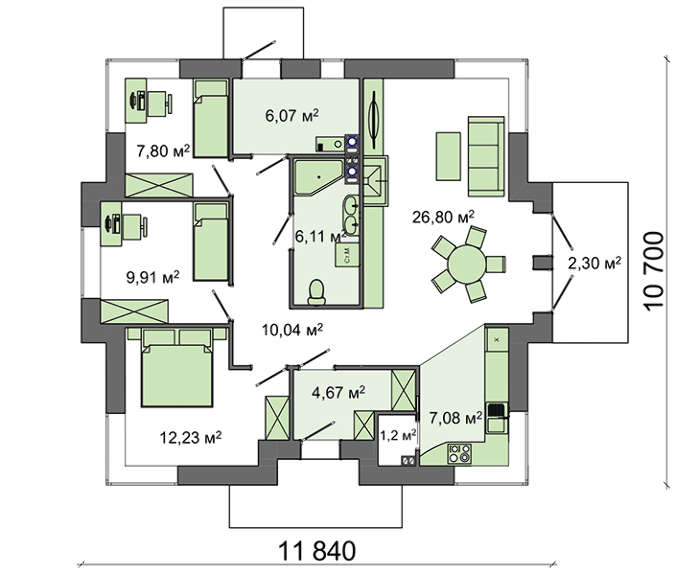 Внутренняя планировка максимально рациональна. В коттедже есть все для комфортного проживания. Центральное место занимает гостиный зал. Он получен путем объединения зоны досуга и столовой. Отсюда легко попасть на открытую веранду, находящуюся перед домом. Здесь в теплое время можно проводить семейные торжества, чаепития, принимать солнечные ванны и вести задушевные беседы. Для кухни отведена угловая часть большого помещения. Близость к обеденному пространству позволяет хозяйке быстро сервировать столы.