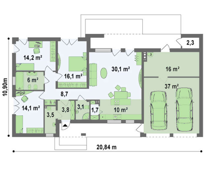 Проект коттеджа хай тек с гаражом на два авто 4M590