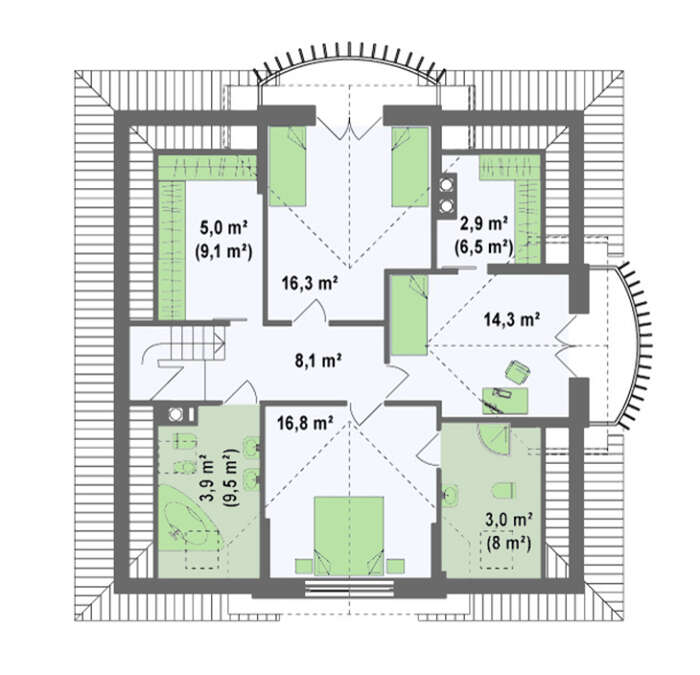 Родители и дети шикарно разместятся в мансарде. Каждому – по отдельной комфортной комнате, да плюс две ванных и вместительный гардероб. Есть даже два балкона с видом на сад. А уж сад-то точно будет, бабушка постарается. Еще и папу к этому делу привлечет. Проект дома с балконами и мансардными окнами учитывает все пожелания.