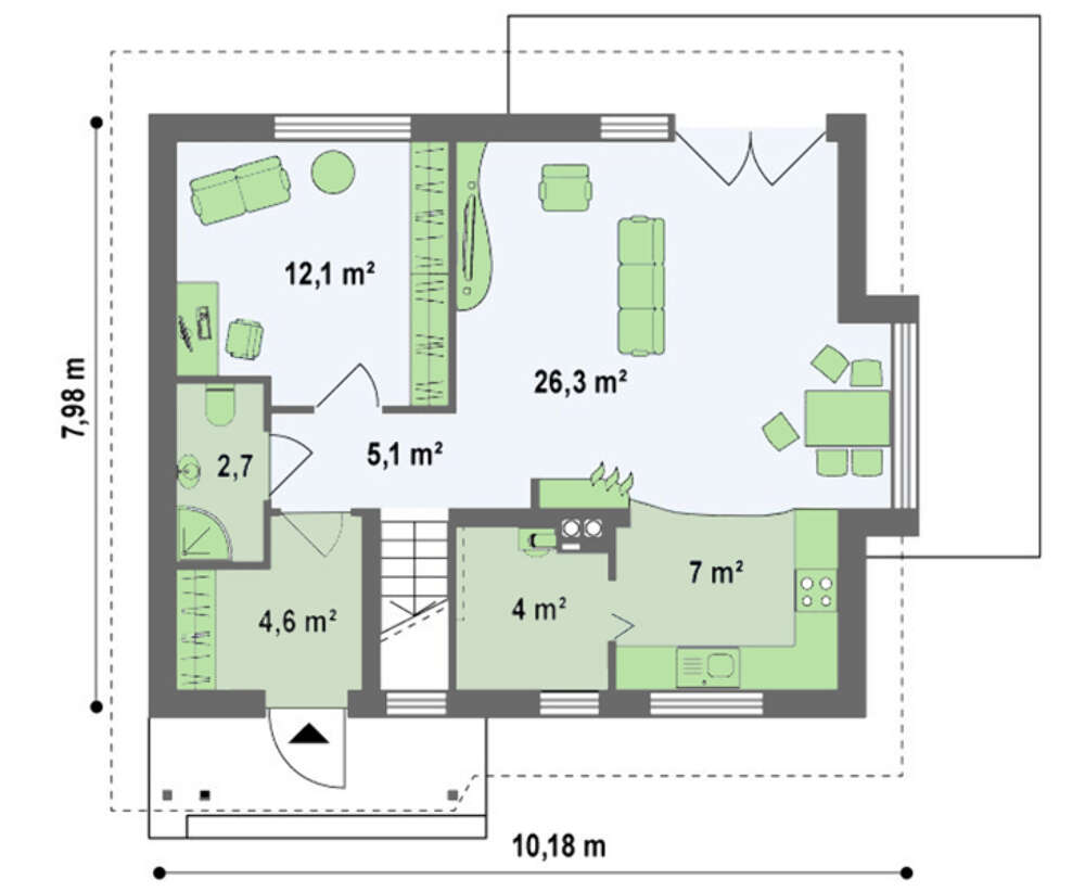 Вообще, главная идея этого дома – рациональное использование каждого квадратного метра. Здесь все функционально и находится на своем месте. Открытая кухня, столовая в эркере с широким окном и небольшая гостиная образуют единое светлое пространство. В большой прихожей предусмотрено место для гардероба, есть кладовка с выходом на кухню.