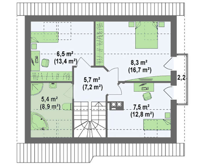 Никакой мистики, просто удачное архитектурное решение: оптимальный наклон двускатной крыши позволяет переоборудовать чердачное пространство под жилую мансарду. А дальше – уже чего душа пожелает. Можно спланировать несколько спален и ванную комнату и, таким образом, защитить личное пространство семьи от посторонних. А можно подумать о кабинете, в котором будут рождаться оригинальные бизнес-идеи или гениальные тексты.