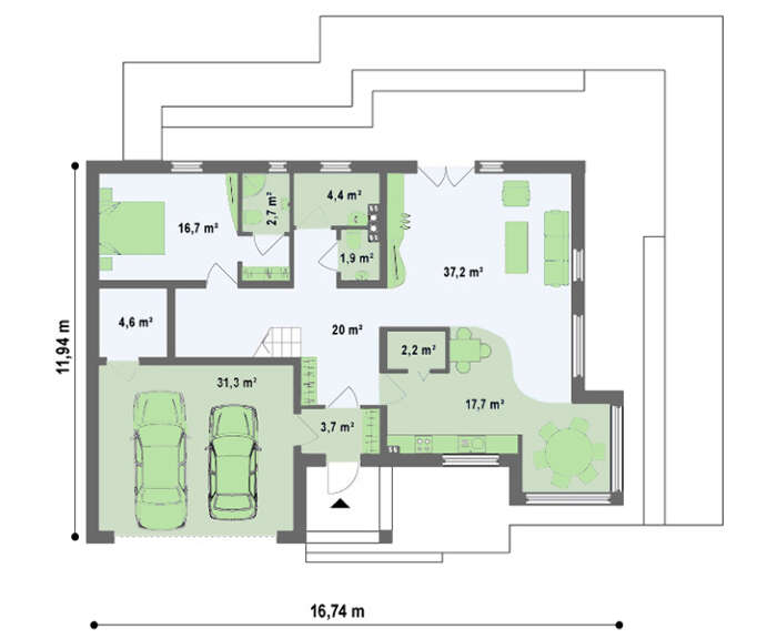 Проект коттеджа с гаражом для двух автомобилей и угловым эркером