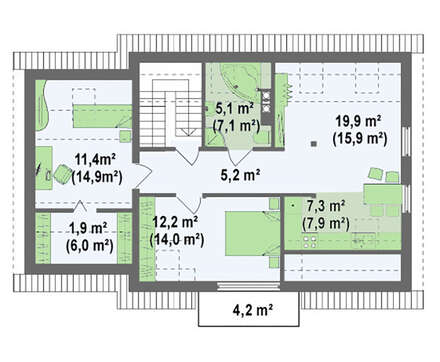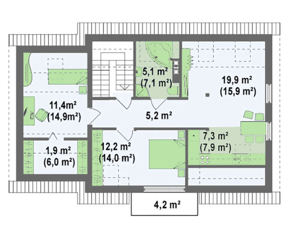 Пространство обоих этажей организовано по классическому принципу: дневная зона, состоящая из гостиной, столовой и кухни плюс спальни. Различие состоит лишь в том, что на втором этаже расположена дополнительная спальня, а санузел с душевой заменен на комфортабельную ванную комнату.
