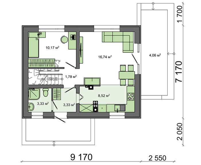 Небольшое помещение первого этажа выделено в изолированную комнату. Такое расположение понравится хозяину дома или старшему поколению семьи. Помещение можно использовать как под кабинет, так и под спальню, на усмотрение проживающих.