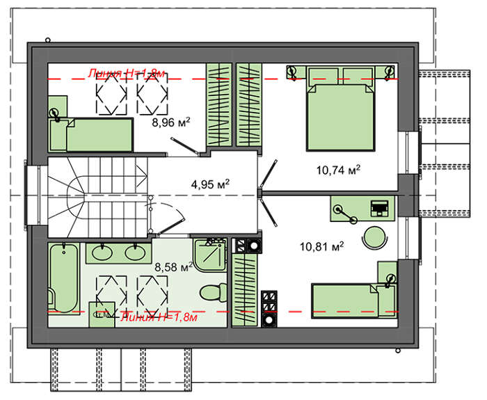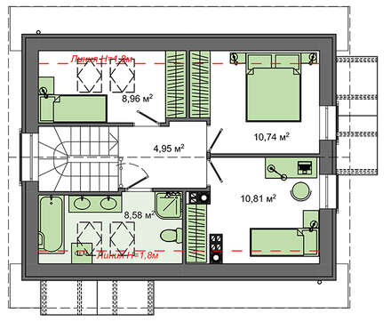 Несмотря на небольшие размеры мансарды, на втором этаже нашлось место под санузел и три компактные спальни, которые помещают все необходимое для создания комфорта.