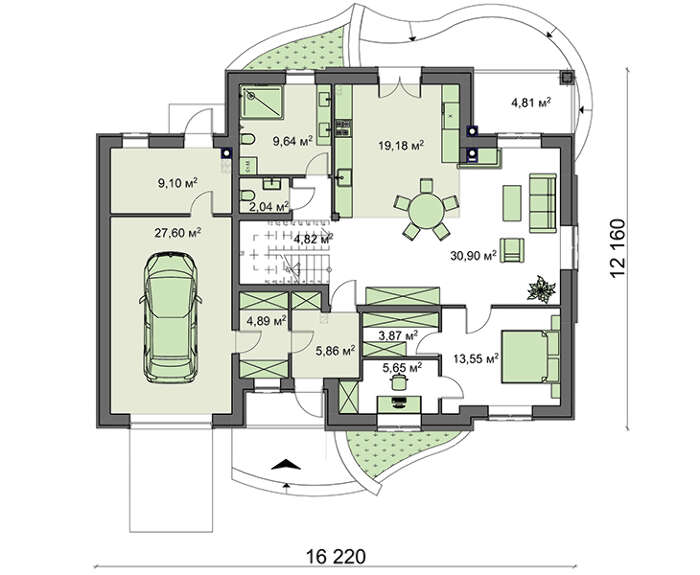 Первый этаж включает апартаменты с гардеробом и личным кабинетом хозяина дома, два санузла, прихожую и кладовую. В пристройке разместился гараж для хранения и обслуживания автомобиля, котельная.