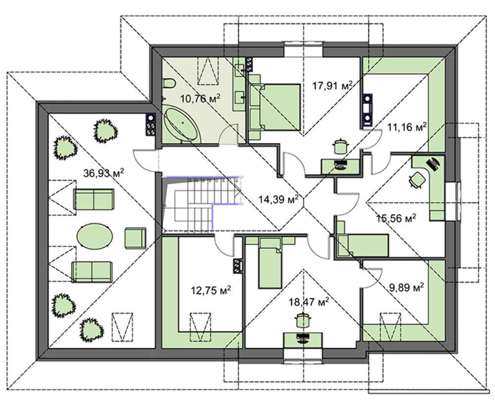 Гордостью второго этажа считается большая комната отдыха с зимним садом в 37 кв. м. Здесь можно собираться всей семьей на утренний кофе или посиделки после ужина. Остальную площадь уровня занимают личные спальни жильцов с просторными гардеробами, холл с лестницей и санузел.