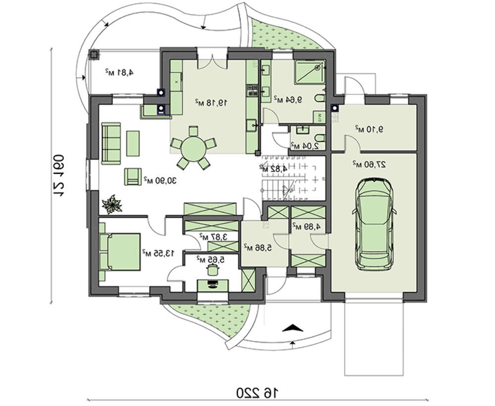 Первый этаж включает апартаменты с гардеробом и личным кабинетом хозяина дома, два санузла, прихожую и кладовую. В пристройке разместился гараж для хранения и обслуживания автомобиля, котельная.