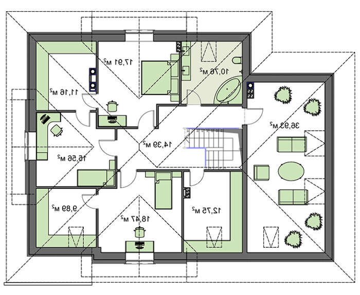 Гордостью второго этажа считается большая комната отдыха с зимним садом в 37 кв. м. Здесь можно собираться всей семьей на утренний кофе или посиделки после ужина. Остальную площадь уровня занимают личные спальни жильцов с просторными гардеробами, холл с лестницей и санузел.