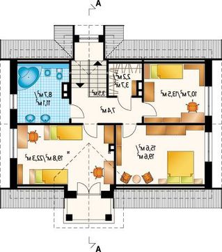При оформлении жилого дома с мансардой и балконом удачно обыгран яркий контраст желтого и коричневого, строгий и дружелюбно-радостный одновременно. Особое внимание уделено кровле сложной формы, которая придает коттеджу роскошный и немного дерзкий вид. Зеленая загородная растительность будет удачным фоном для подачи красивого жилья.