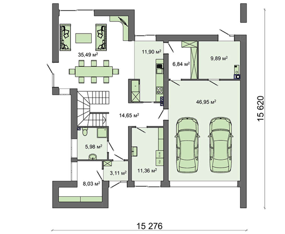 К гостиной примыкает открытая терраса, в теплое время года она увеличивает площадь отдыха. Особого внимания заслуживает просторный автомобиль на две машины, места хватит для хранения мотоцикла или скутера.