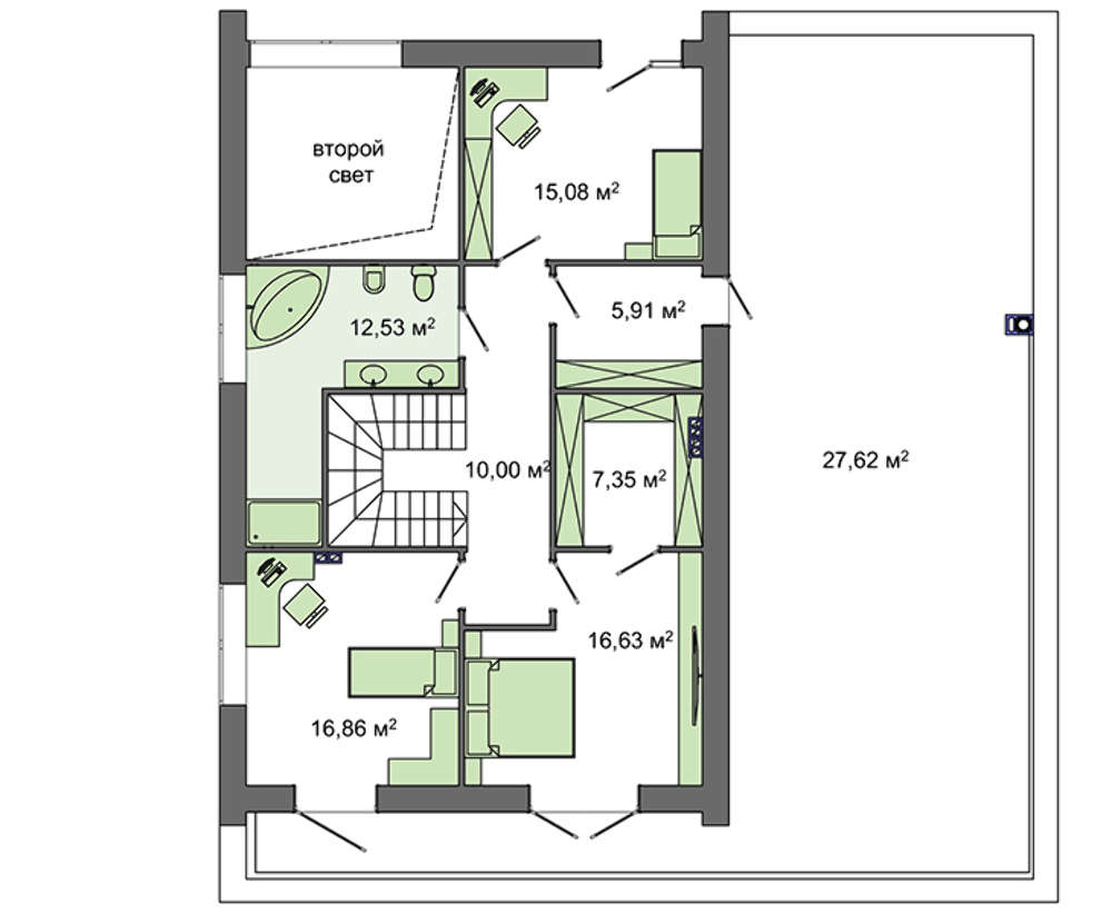 Верхний этаж — это зона сна, площадь отдана личным спальням. Фишкой второго уровня считает огромная терраса на крыше гаража. Цокольный этаж площадью 85 кв. м. вместит достаточное количество помещений по интересам.