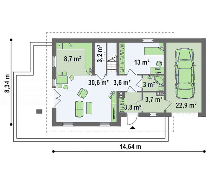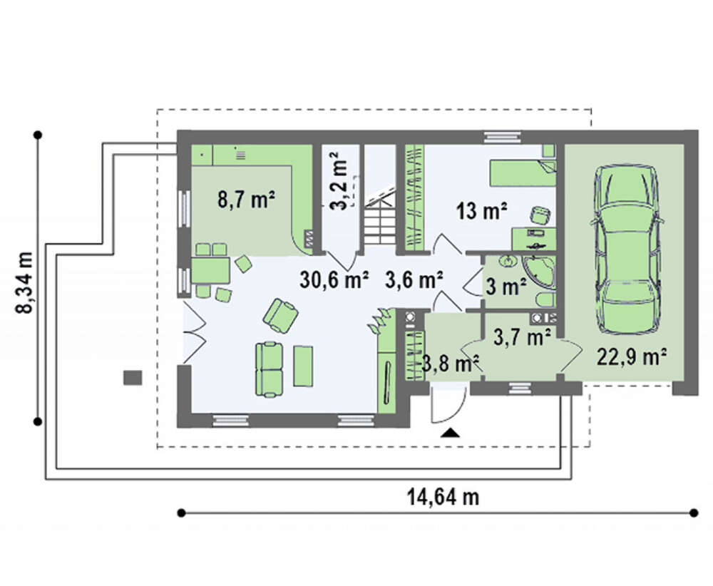 Считайте сами: небольшой по площади фундамент, простая форма дома и крыши - все эти моменты здорово удешевляют процесс строительства. Сюда же стоит добавить гараж. Для его утепления нет нужды монтировать отдельную систему отопления. Можно просто подключиться к инженерным сетям дома. Вот вам и еще одна дополнительная статья экономии. А расположенная сверху над гаражом просторная терраса, придает дому современные очертания. К тому же, дополнительная рекреативная зона, в которую можно пройти прямо из спальни – это несомненное удобство. Также эффективно используется навес над уютной террасой, примыкающей к дневной зоне на первом этаже.