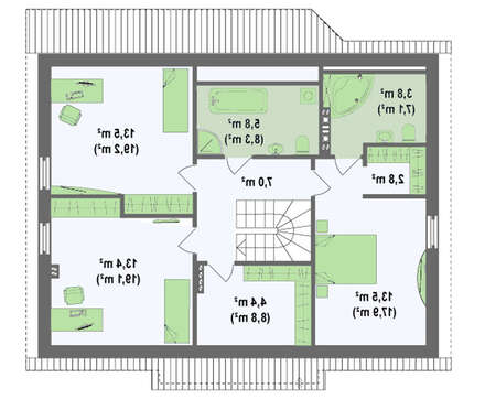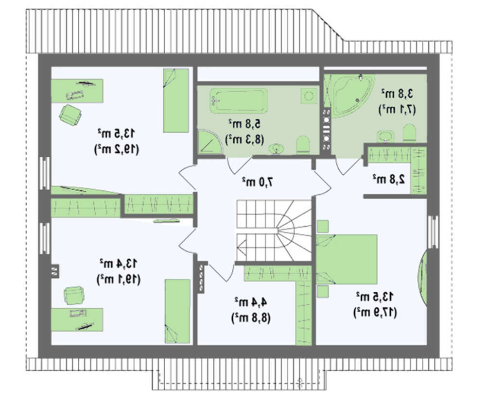 А вот в ночной зоне, расположенной в мансарде, заложенные в проекте преимущества, можно реализовать сполна. Если появится необходимость, просторную гардеробную можно переоборудовать под дополнительную спальню. В крайнем случае, можно отказаться от второй ванной в пользу дополнительных квадратных метров жилой площади. А отсутствие несущих стен на этаже позволяет передвигать стенные перегородки и перекраивать внутреннюю планировку по своему усмотрению.
