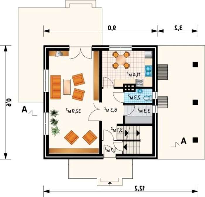 Пространство первого этажа поражает простотой планировки. На площади нижнего уровня расположено минимальное, но достаточное количество помещений. Место приема пищи соединено со столовой, что позволяет домашние обеды или небольшие дружеские встречи проводить в объединенном уютном помещении. Здесь хозяйке легко контролировать ситуацию и успевать сделать много дел одновременно.