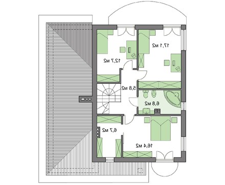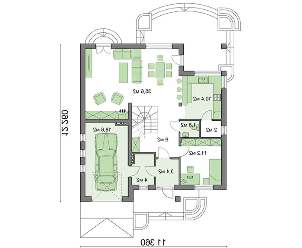 Планировка первого этажа выполнена в духе европейских усадеб. Общая площадь собрана вокруг лестницы, лишена перегородок. Отдельный выход позволяет из гостиной через овальную веранду легко покидать помещение, сразу окунутся в царство астр, елей и лужаек, постриженных ровно, словно под линеечку.