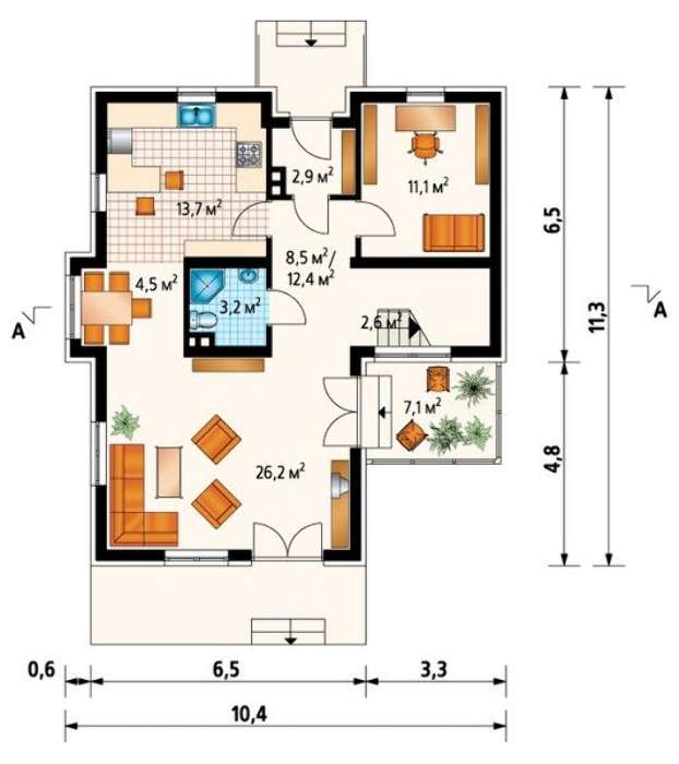 Проект содержит три раздела – АрхитектурныйКонструктивный и Инженерный: водоснабжение, отопление, вентиляция, канализация, электроснабжение (приобретается за дополнительную плату) + Пояснительная записка.