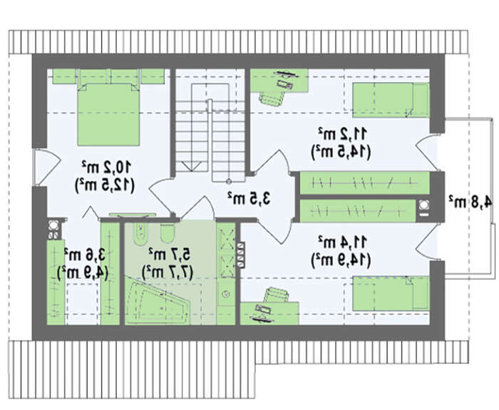 Ночная зона расположена в мансардном этаже. Здесь размещены три спальни. К одной из них примыкает большая гардеробная комната. А из двух других ведут выходы на балкон. Для полного комфорта жильцов, на этаже предусмотрена удобная ванная комната.