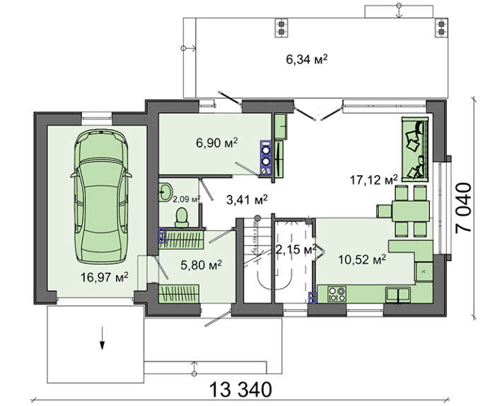 Проект небольшого аккуратного дачного коттеджа с гаражом и мансардой
