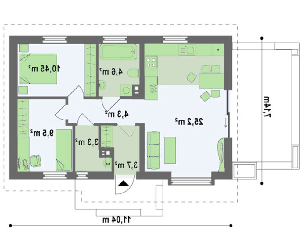 Проект небольшого классического одноэтажного дома представляет собой вариант проекта 4M053 с небольшими изменениями в планировке. Простая форма самого дома и двускатной кровли позволяют строить быстро и экономно. А небольшие затраты на коммунальное обслуживание добавляют еще один плюс в перечень достоинств дома.