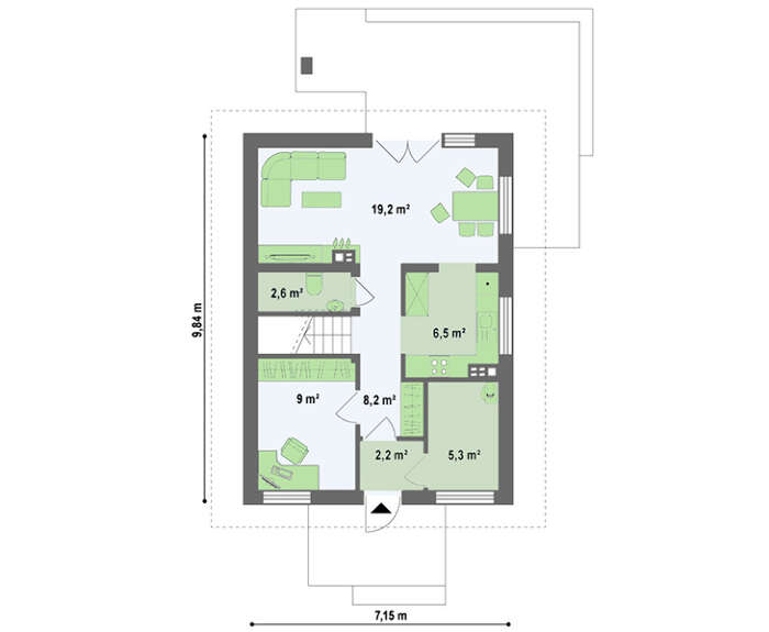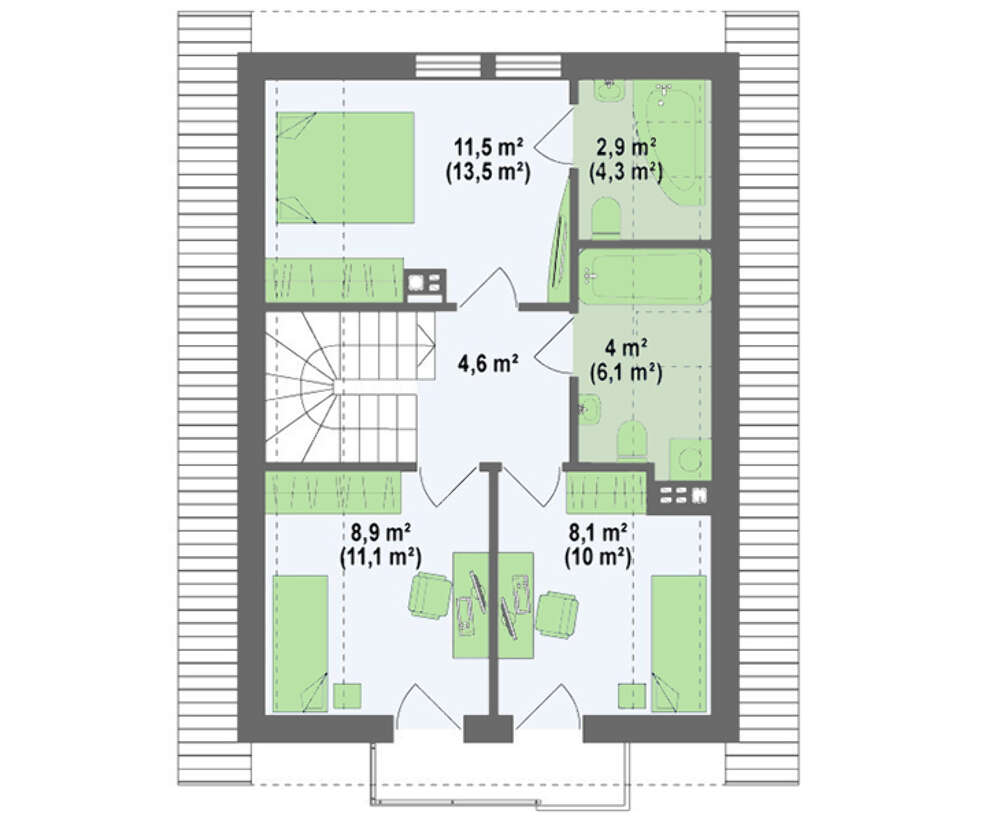 По комфорту и функциональности небольшой дом для узкого участка не уступает квартире в городской многоэтажке. В проекте удачно сочетаются современные городские удобства и прелесть загородного дома. Именно это делает его привлекательным с точки зрения жилья для семьи из 4-5 человек.