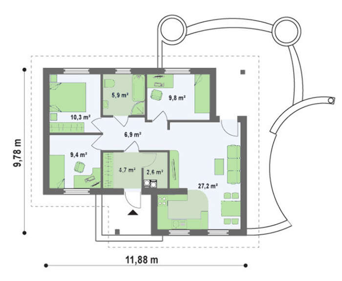 Проект небольшого одноэтажного дома с тремя спальнями 4M066