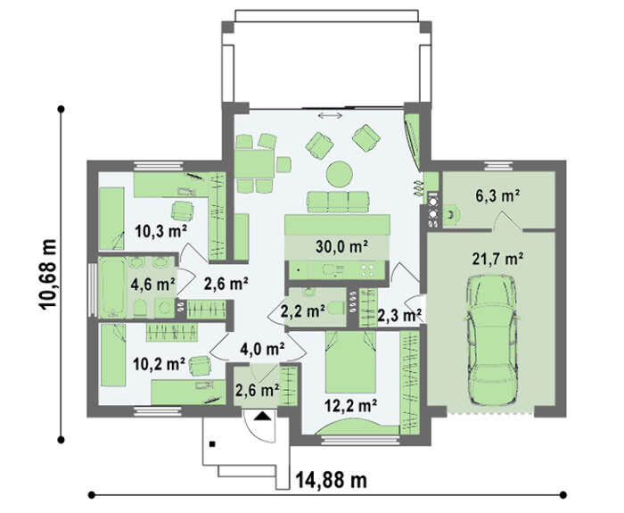 Гостиную с камином, объединенную с открытой кухней, органично дополняет терраса. Без сомнения, эта часть дома станет центром семейной жизни. К ней примыкает ночная зона, состоящая из трех уютных спален. А справа расположен гараж с собственным подсобным помещением.