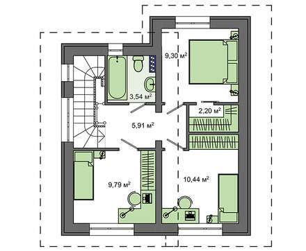На втором этаже находятся три личные спальни обитателей дома и ванная. В комнате отдыха хозяина предусмотрен собственный гардероб.