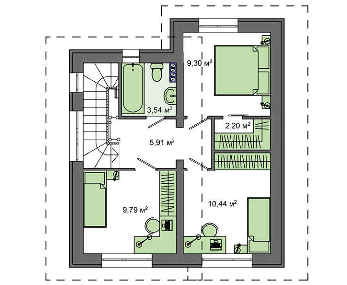 На втором этаже находятся три личные спальни обитателей дома и ванная. В комнате отдыха хозяина предусмотрен собственный гардероб.