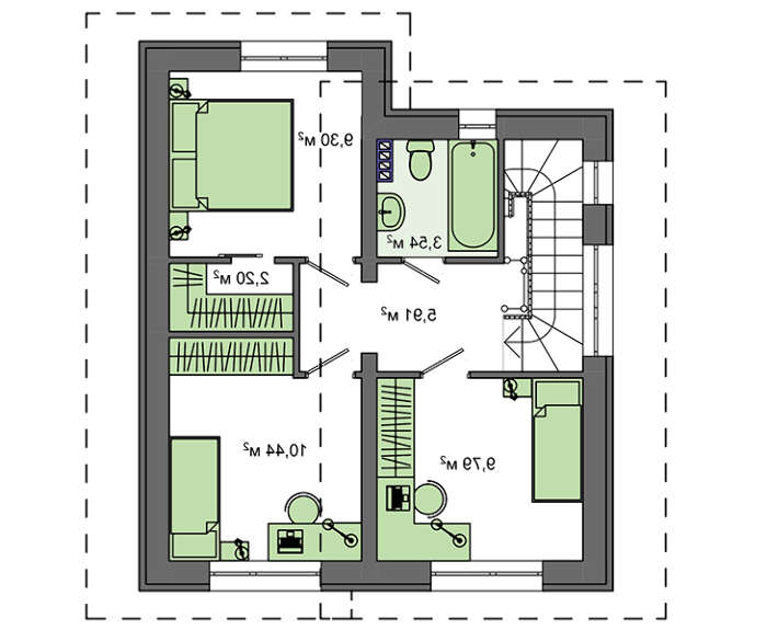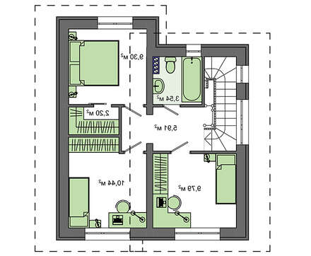 На втором этаже находятся три личные спальни обитателей дома и ванная. В комнате отдыха хозяина предусмотрен собственный гардероб.