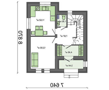 Внутри использована классическая планировка. Первый этаж отдан под зону бодрствования, на втором находится территория сна. Две трети площади нижнего уровня занимает гостиный зал и кухня-студия. Они примерно одинаковые по размерам. В первой комнате хозяева отдыхают, встречают гостей, проводят деловые переговоры. В столовой готовят и принимают пищу, устраивают дружеские посиделки. На остальной площади размещен холл с лестницей, прихожая, санузел и тамбур.