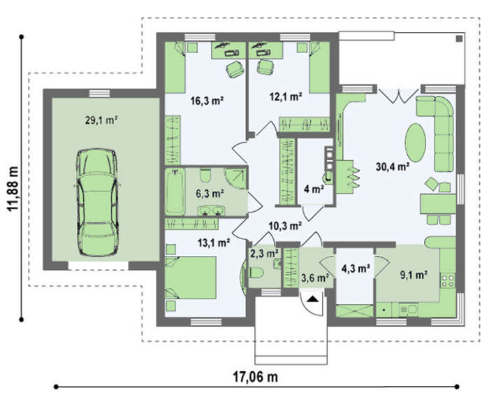 Проект одноэтажного дачного классического дома с четырехскатной крышей