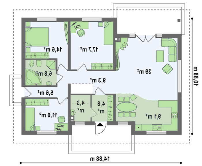 Проект одноэтажного дома классического стиля с четырехскатной крышей 4M400G