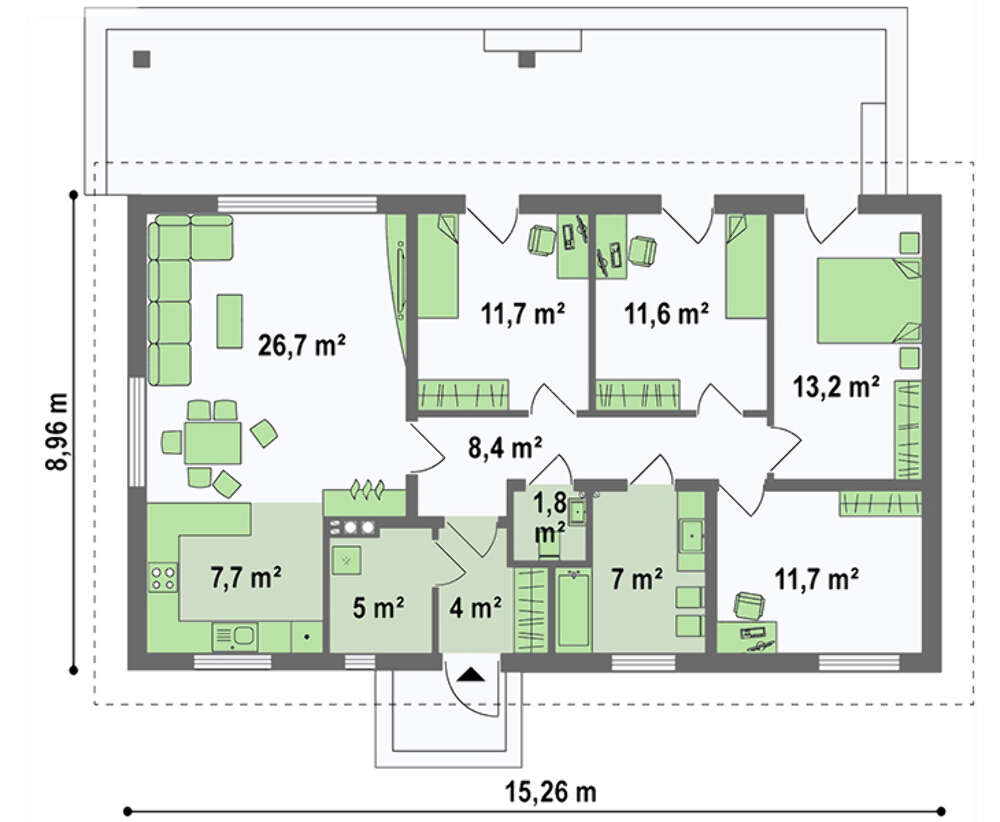 Проект одноэтажного дома общей площадью 126 кв.м. 4M7042