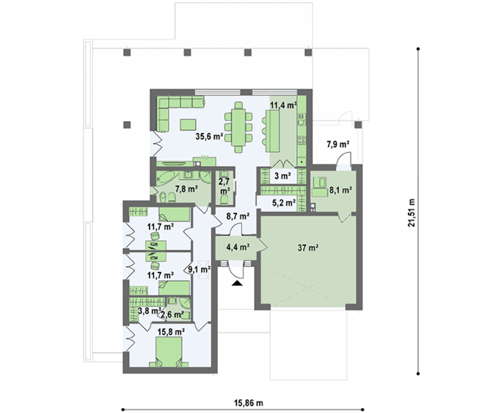 Проект одноэтажного дома площадью 186 кв. м с декором из искусственного камня