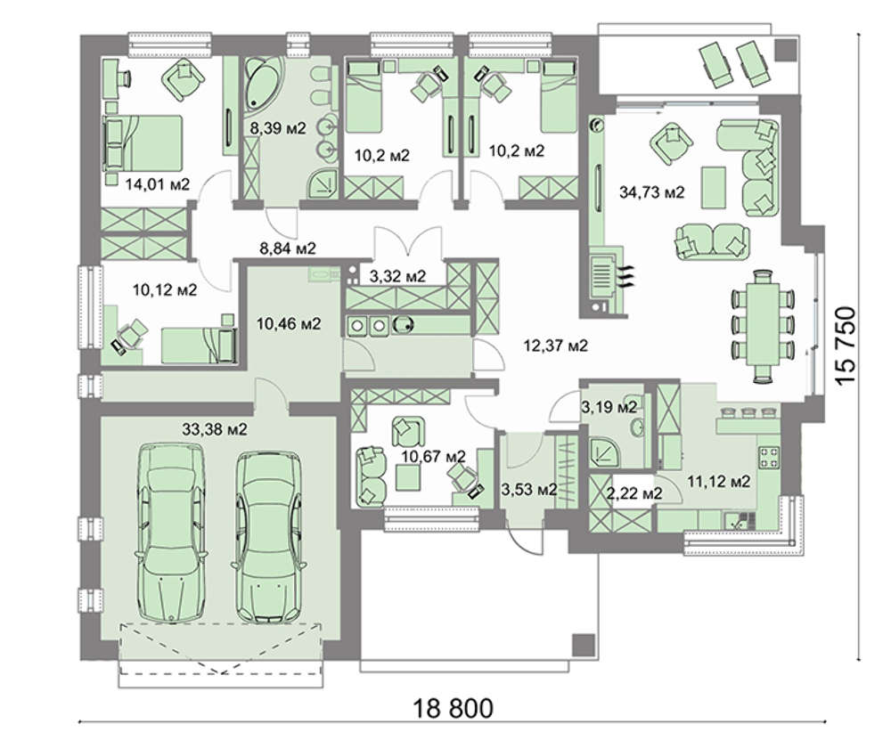 Несколько подсобных помещений может быть использовано под разные 996функции на усмотрение хозяев. Особого внимания заслуживает отдельное помещение площадью 10 квадратов. Оно не включено ни в одну из зон, расположено рядом с входом на террасу. В случае определения комнаты под спальню, такое расположение позволяет хозяевам вести свободный образ жизни, покидать пространство дома в любое время суток.