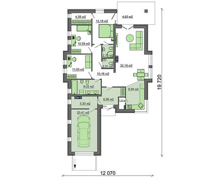 Великолепный одноэтажный коттедж, выполненный в немецком стиле, станет не только украшением загородного участка, но и комфортабельным жильем для среднестатистической семьи. В основе европейской архитектуры лежат принципы рационализма и практичности. Это воплощено как в экстерьере, так и в планировке дома. Коттедж представлен прямоугольной коробкой с пристроенным помещением гаража. Небольшой цоколь, крыльцо гостиной и входной портал декорированы искусственным камнем. Украшением дома является просторная открытая терраса с колонной и деревянной конструкцией для летнего солнцезащитного навеса. Окна прямоугольные, двери панорамные, крыша четырехскатная из металлочерепицы.