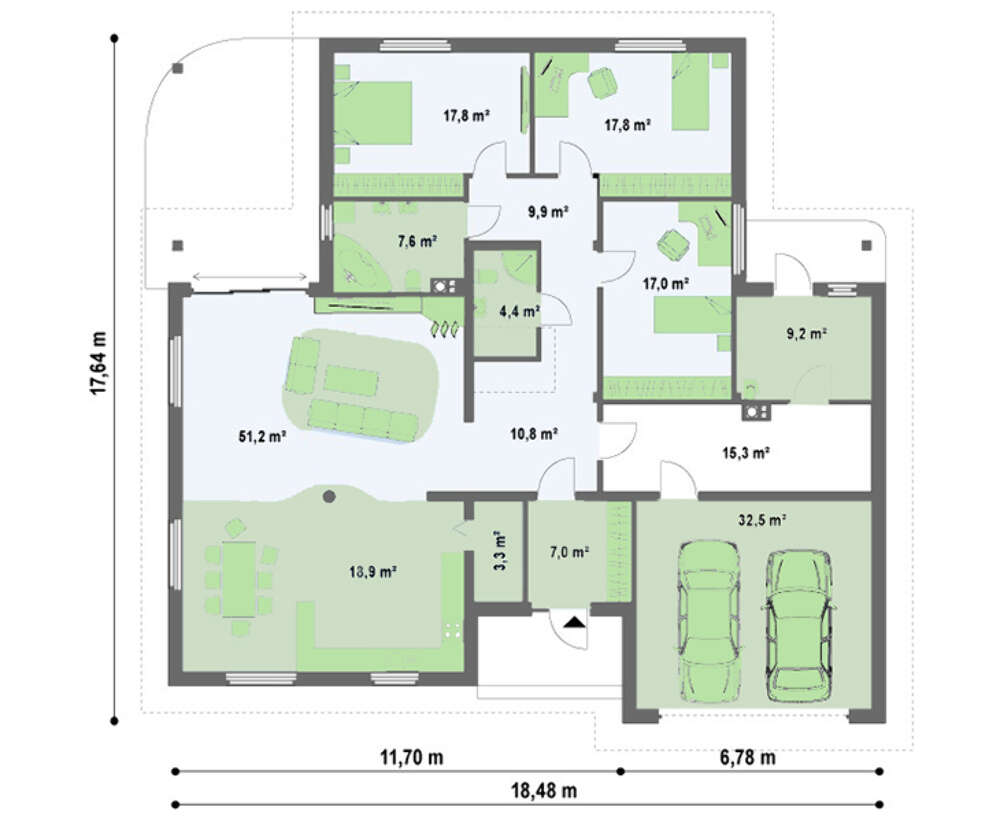 Проект одноэтажного коттеджа с гаражом для 2 машин