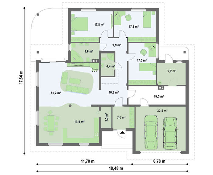 Проект одноэтажного коттеджа с гаражом для 2 машин 4M492